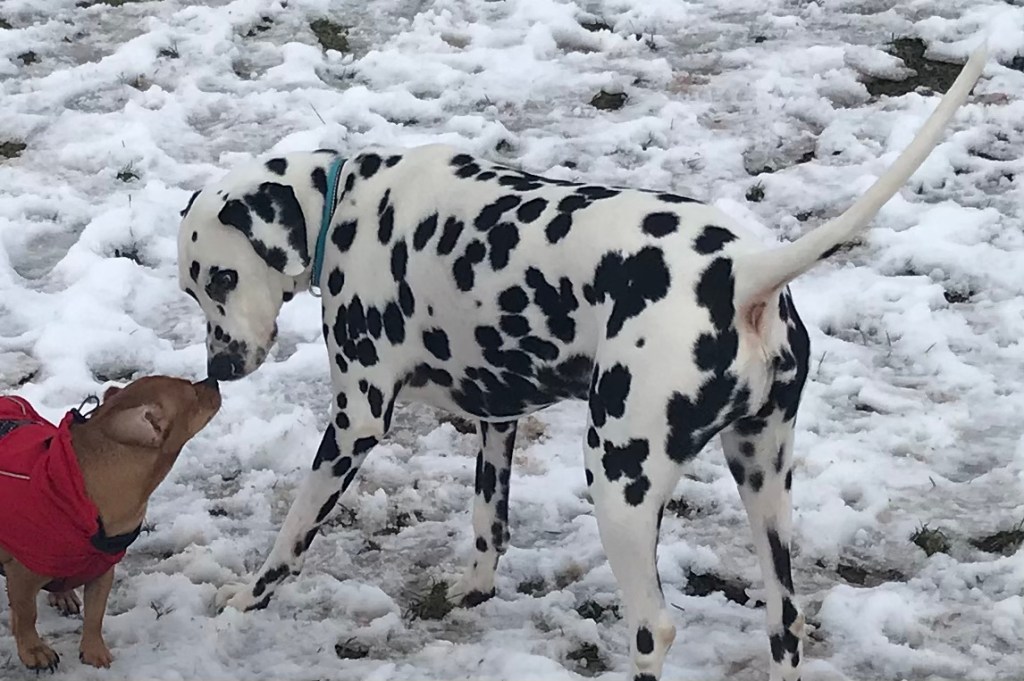 It was January 1st 2021 and I was walking along the common plot with my neighbour Jackie and her small dog Charlie, a Dachshund and Chihuahua mix. It had snowed heavily the day before and the plot was white over. Half way round a gorgeous Dalmatian with a blue collar comes running over and kisses Charlie on the nose. The Dalmatian against the snow was stunning and the black dots a real contrast.